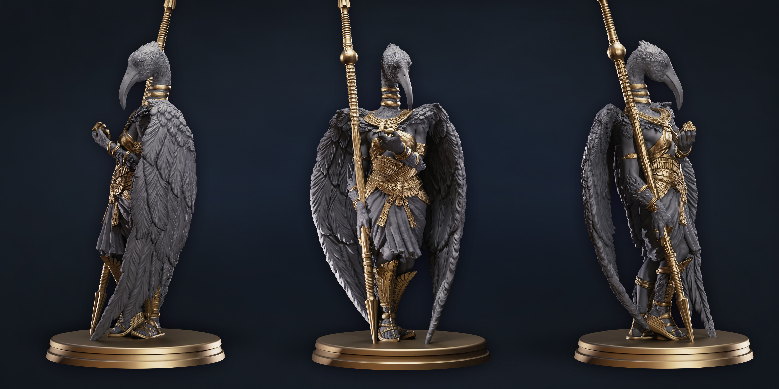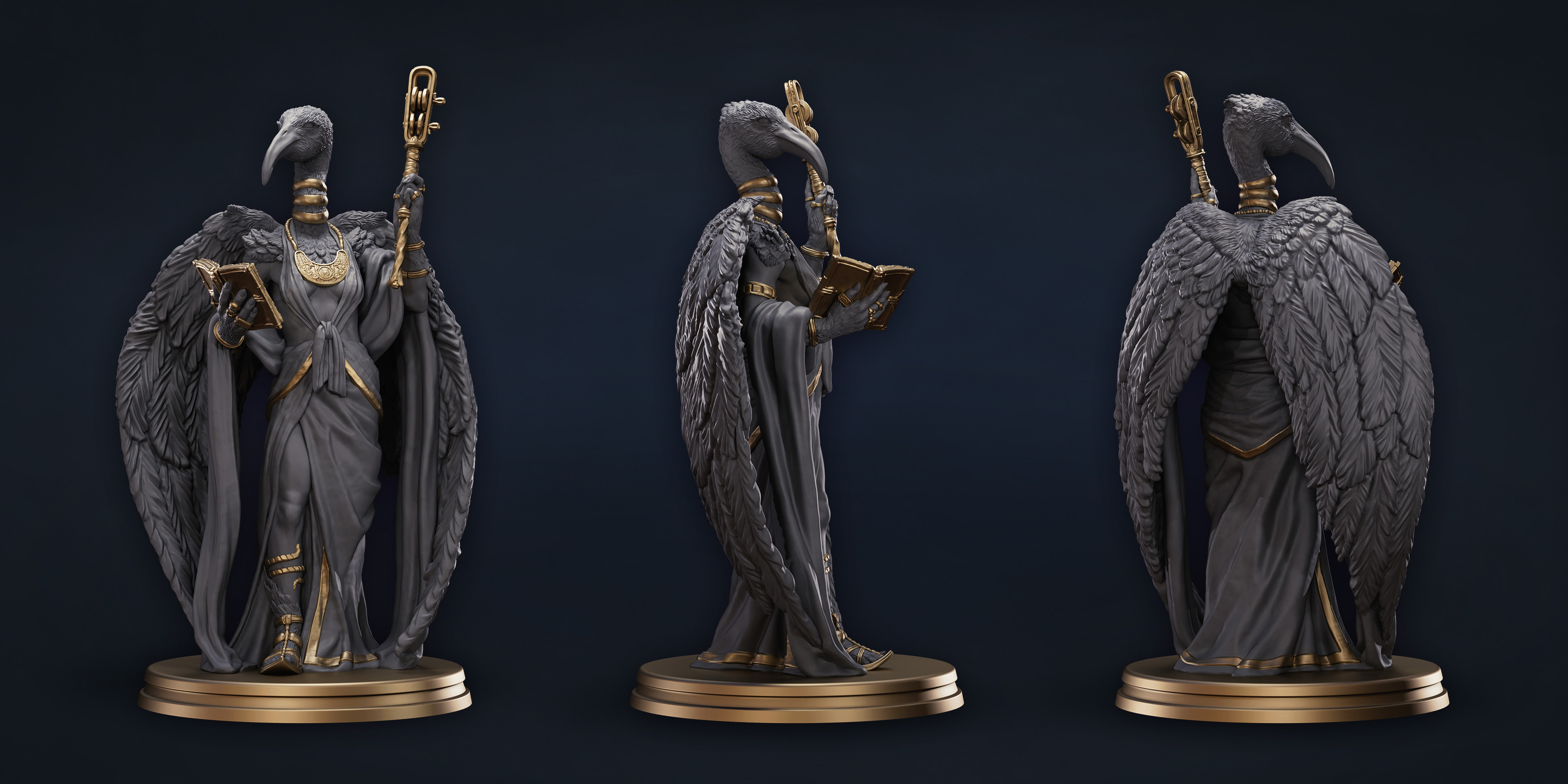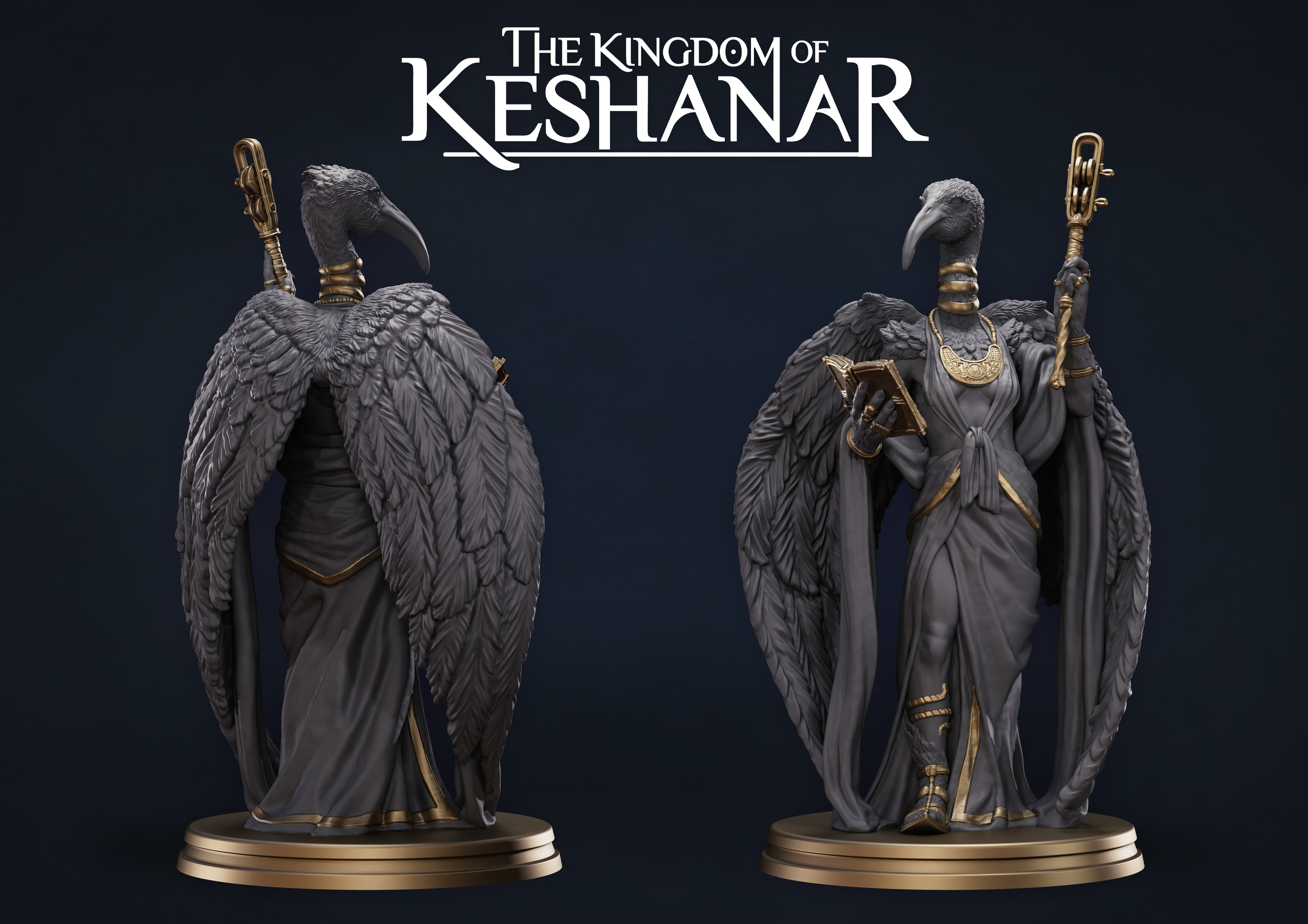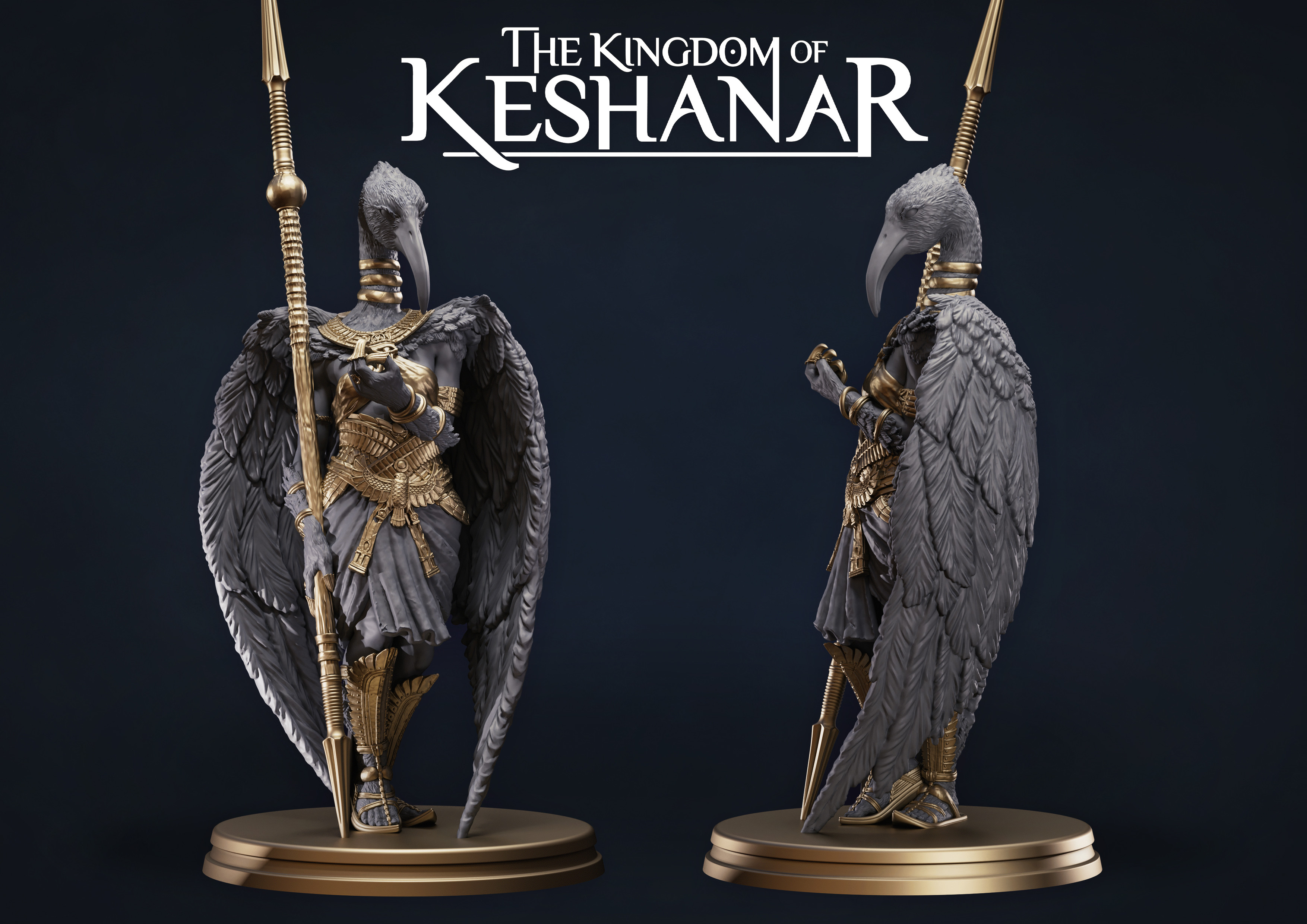She was sculpted in tandem with Astennu and ended up providing the biggest challenges in this set of characters. I worked closely with the print team to ensure that the feather details were structurally sound and stayed appealing at-scale. Of all the Celeshu characters, she went through the most iterations to finalize the look.
